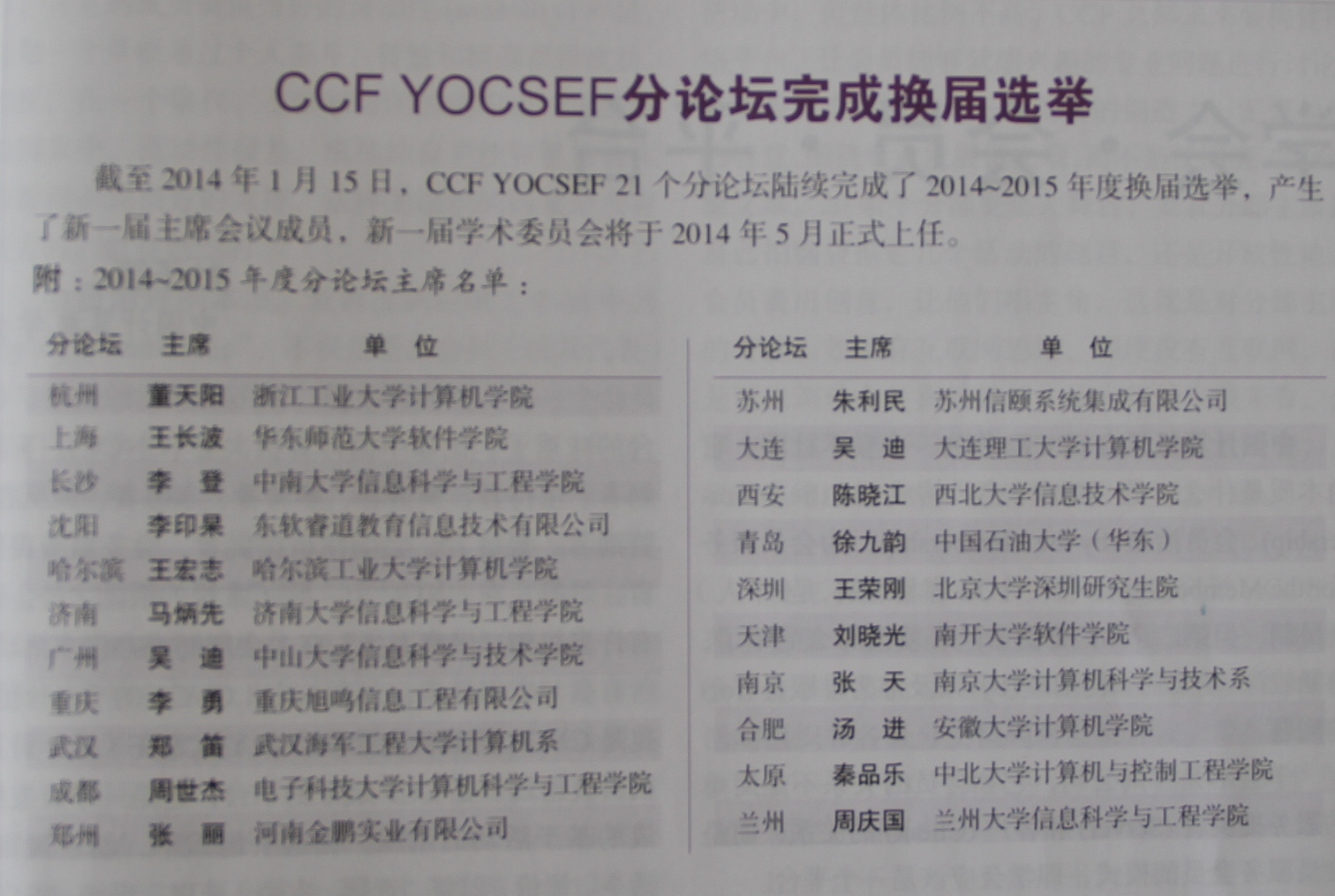 CCF YOCSEF(青年计算机科技论坛)创建于1998年,由来自全国具备思想和社会责任感的学者、企业家及其他各界青年精英参与策划与组织,是CCF最具活力的部分。除北京总部外,已在20个大城市建立了分论坛。
