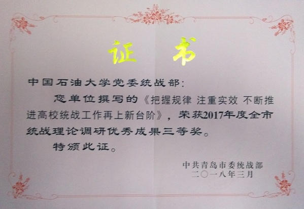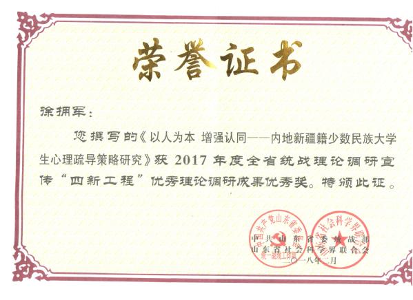 近日,全省统战部长会议和青岛市全市统战部长会议召开,党委统战部部长王德钊参加会议。会上就一年来的工作进行了总结和表彰,yl34511线路中心多项成果获得省市表彰。其中徐拥军、孙鹏燕、李宝玺、葛长波等撰写的《以人为本 增强认同 内地新疆籍少数民族大学生心理疏导策略研究》获全省统战理论调研宣传“四新工程”优秀理论调研成果优秀奖;党委统战部选送的《把握规律 注重实效 不断推进高校统战工作再上新台阶》获青岛市统战理论调研优秀成果三等奖。