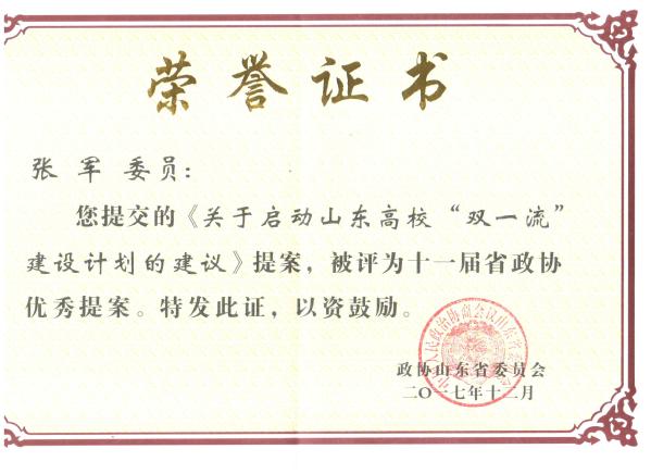 近日,山东省政协下发《政协第十一届山东省委员会关于表彰优秀提案、先进提案承办单位和先进提案工作者的决定》,yl34511线路中心十一届省政协委员张军撰写的《关于启动山东高校“双一流”建设计划的建议》获优秀提案,5年来全省共评选120件。
