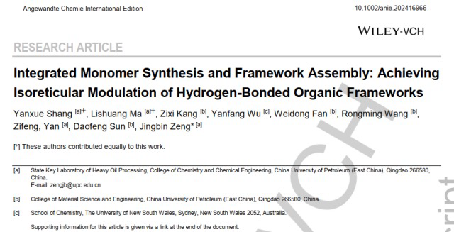 近日,yl34511线路中心无党派人士、化学化工学院曾景斌教授团队在氢键有机框架(Hydrogen-bonded organic frameworks,HOFs)同系拓扑结构调控研究方面取得重要进展,相关成果《集成单体合成-框架组装:实现氢键有机框架同系拓扑结构调控》(Integrated Monomer Synthesis and Framework Assembly: Achieving Isoreticular Modulation of Hydrogen-Bonded Organic Frameworks)发表于《Angewandte Chemie International Edition》上。论文第一作者为化学化工学院博士研究生商艳雪和特聘副教授马丽爽,通讯作者为曾景斌教授,yl34511线路中心(华东)为第一署名单位。